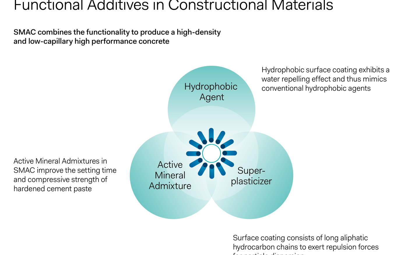 In concrete chemistry, a wide array of additives are employed to control the workability and physical properties of the cement paste. We are currently evaluating the SMAC product platform as a three-in-one additive covering the functionalities of mineral admixtures, hydrophobic agents, and superplasticizers: