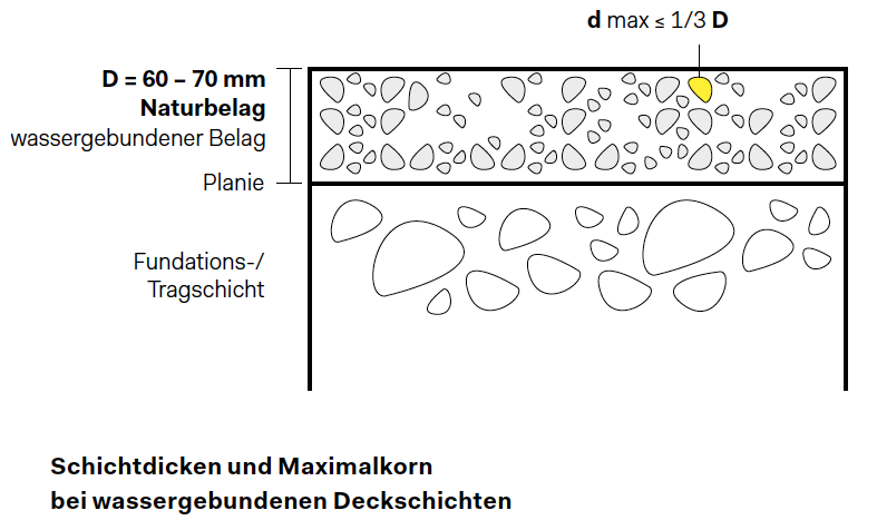Wer KFN Netstaler® 0–15 mm geschlammt für einen ungebundenen Oberbau verwendet, schafft perfekte Voraussetzungen. Der enthaltene Kalksteinschlamm, das gebrochene Korn und die optimale Kornabstufung sorgen für eine optimal verdichtbare, hohlraumarme und damit erosionsfeste Schicht. Wir empfehlen den Einsatz einer Deckschicht aus gebrochenem Kalksteinschotter mit einer Dicke von 60 bis 70 mm. Abweichungen von der Sollschichtdicke beim Einbau bis zu 20 % sind zulässig. Das Grösstkorn liegt im optimalen Fall im Bereich von einem Drittel der Schichtdicke. Hier lässt Netstaler Kies Ihnen Spielraum: Durch das kleine Grösstkorn von 15 mm kann auch bei diesen Abweichungen der optimale Schichtverbund an jeder Stelle gewährleistet werden. Einbauen lässt sich unser Kalksteinschotter sowohl von Hand als auch maschinell. Um eine bestmögliche Ebenheit zu erreichen, wird der maschinelle Einbau bevorzugt. Nach dem Einbau sollten Naturstrassen, Waldwege etc. gesperrt werden, um sich setzen zu können. Dabei bilden sich auch die Carbonatbindungen optimal aus. Je nach Witterung und Nutzungsart sind dazu mindestens vier Wochen nötig.