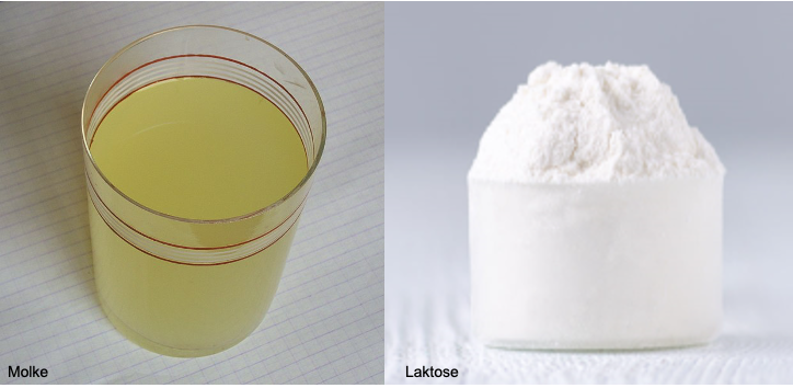 Die neben der Molke übrig gebliebene Lösung enthält Laktose (Milchzucker). Diese wird aus der Flüssigkeit abgetrennt und als weisses Pulver gewonnen. Laktose schmeckt leicht süsslich. Sie dient unter anderem als Ausgangsstoff für Milchsäure und wird Tiefkühlkost zur Verbesserung der Textur beigesetzt. Aufgrund ihres geringen Preises, der guten Verfügbarkeit und der Tatsache, dass sie praktisch keine schädlichen Wirkungen aufweist, wird Laktose in der Pharmaindustrie zudem auch als Hilfsstoff zur Tablettierung verwendet.