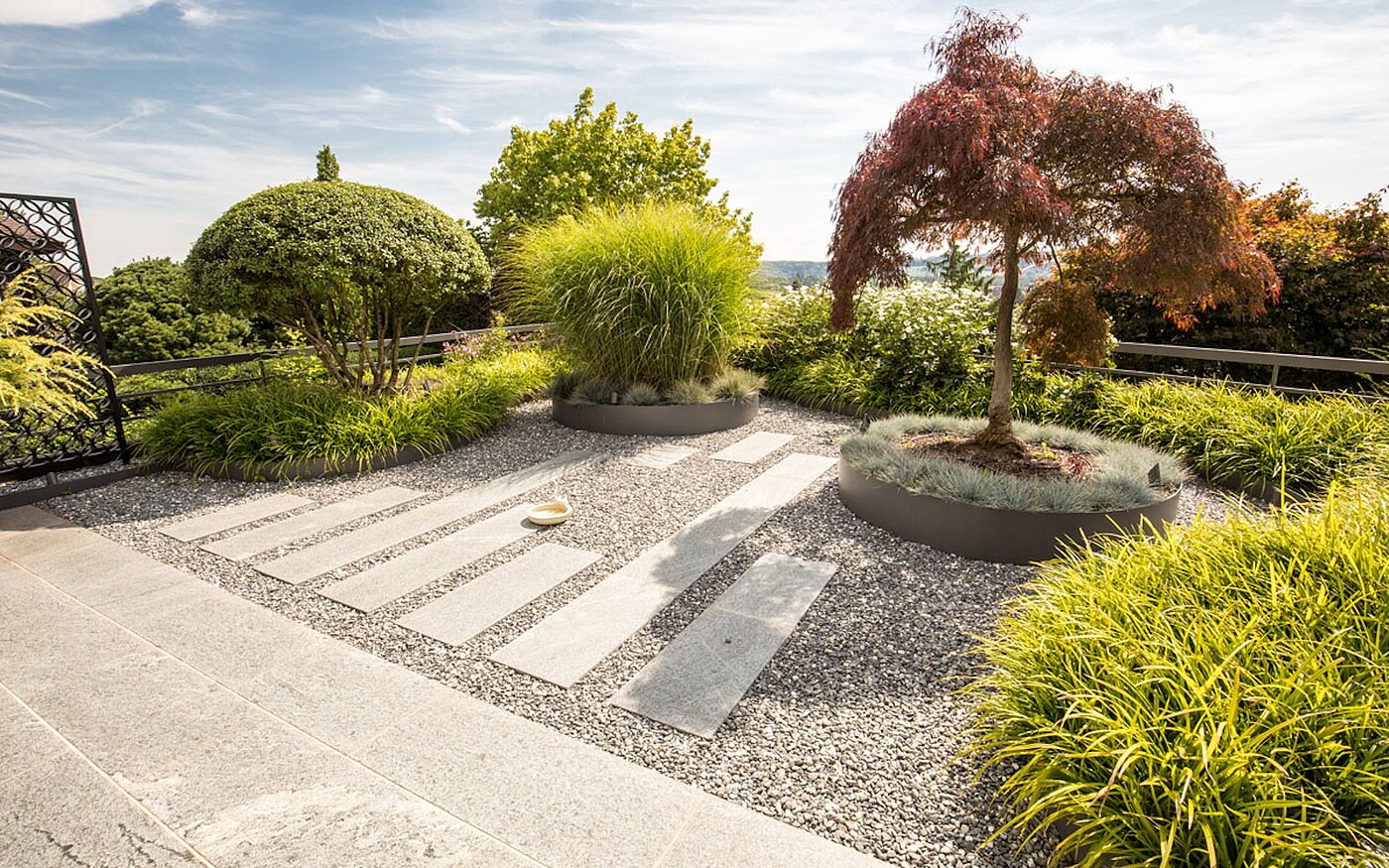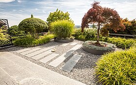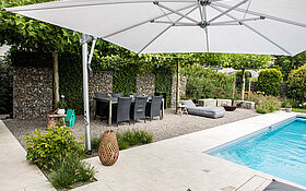 Wie ein von der Zweifel Gruppe gestalteter Badegarten zeigt, lässt sich KFN Netstaler® auch ideal mit anderen Materialien kombinieren. So bildet der Netstaler Kalksteinschotter eine sickerfähige, stabile Fundation, während Flusskies darüber für ein angenehmes Trittgefühl sorgt. Obwohl der Belag bereits mehrere Jahre alt ist und unmittelbar an Platanen mit starkem Wurzelwuchs angrenzt, hat er sich bisher als wartungsfrei bewährt. «Kies und Schotter haben den grossen Vorteil, dass sie dem Wurzeldruck gut standhalten – ein harter Belag ginge kaputt», erläutert Zweifel. «Zudem harmoniert Netstaler® farblich optimal mit anderen Materialien, was den langfristigen Unterhalt erleichtert.»