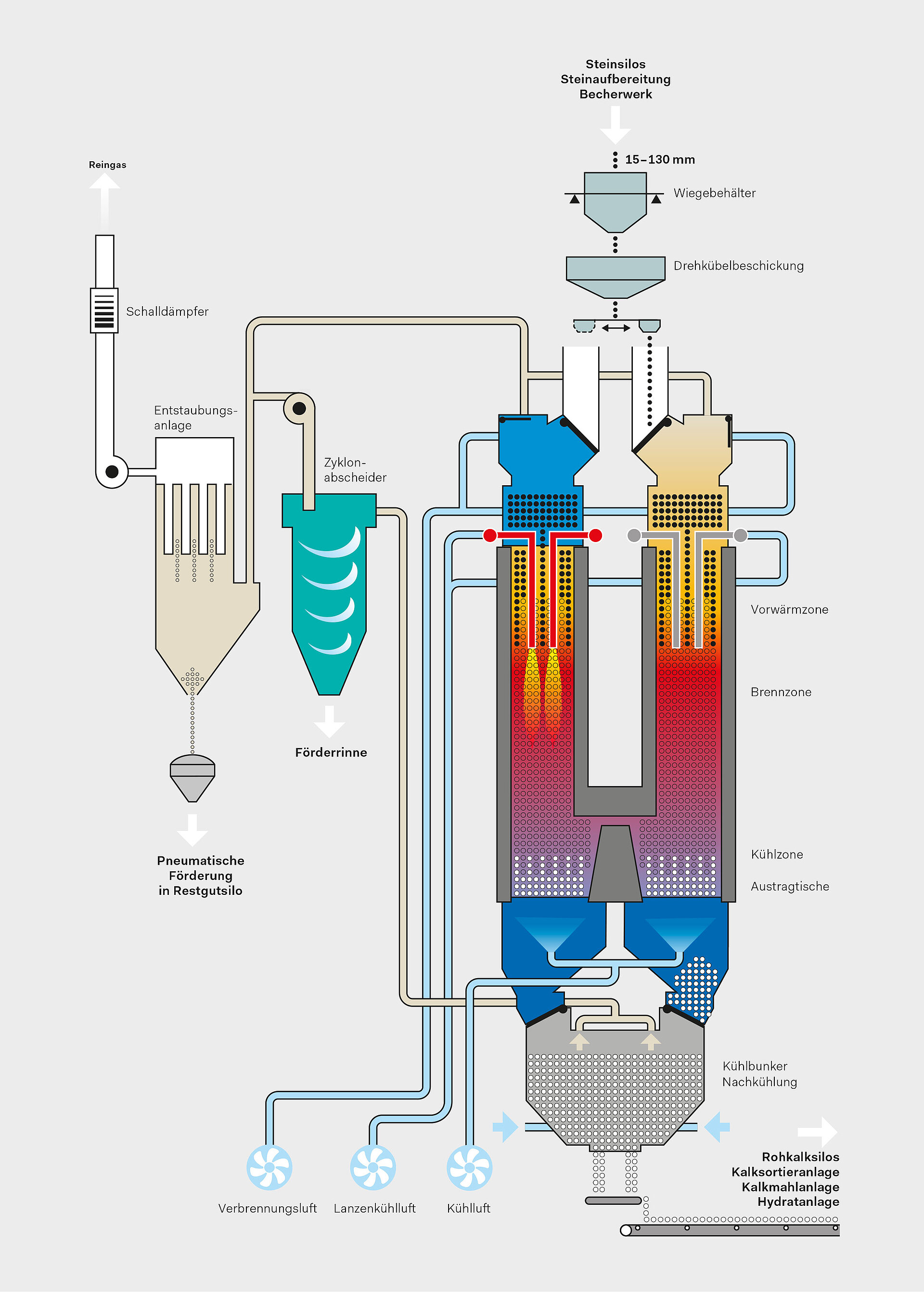 Aus der Steinaufbereitung wird vorsortierter Kalkstein über einen Drehkübel abwechselnd in zwei Ofenschächte gefüllt. Im Brennprozess sind stabile Temperaturen wichtig: Darum wird der Kalk zuerst in einer Vorwärmzone aufgewärmt, bevor er in der Brennzone mit bis zu 1100 °C gebrannt wird – und dabei den grössten Teil des enthaltenen CO2 und rund die Hälfte seines Gewichts verliert. Nach der mehrstufigen Abkühlung kommt der gebrannte Kalk dann zur Zwischenlagerung in Silos.